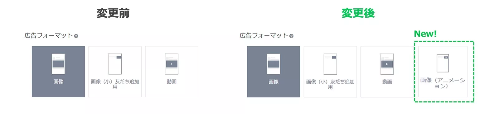 キャンペーンの目的で「友だち追加」を選択した際の広告フォーマットに、新たに画像(アニメーション)を追加しました。画像(アニメーション)の配信面はトークリストとなります。