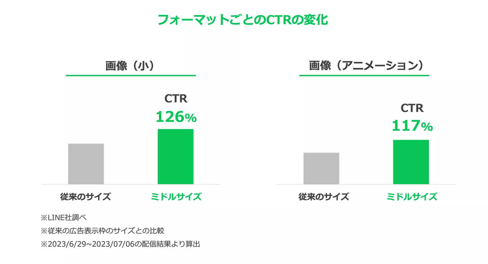 また、フォーマットごとのCTRは、従来の広告表示サイズと比較して画像(小)で126%、画像(アニメーション)で117%と、広告効果が向上しているという結果となりました。