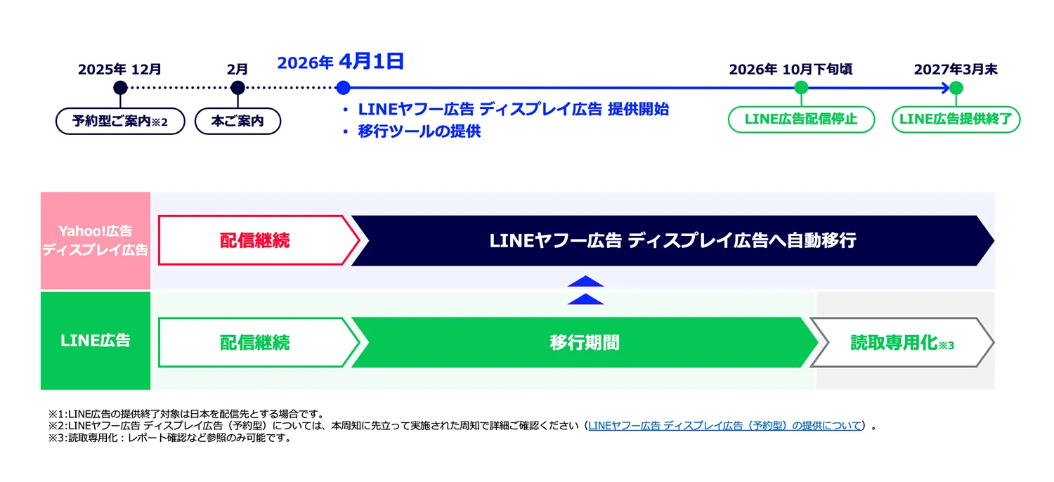 LINE広告は2026年10月下旬頃に広告配信を停止予定です。それまでに、LINEヤフー広告への移行を完了してください。