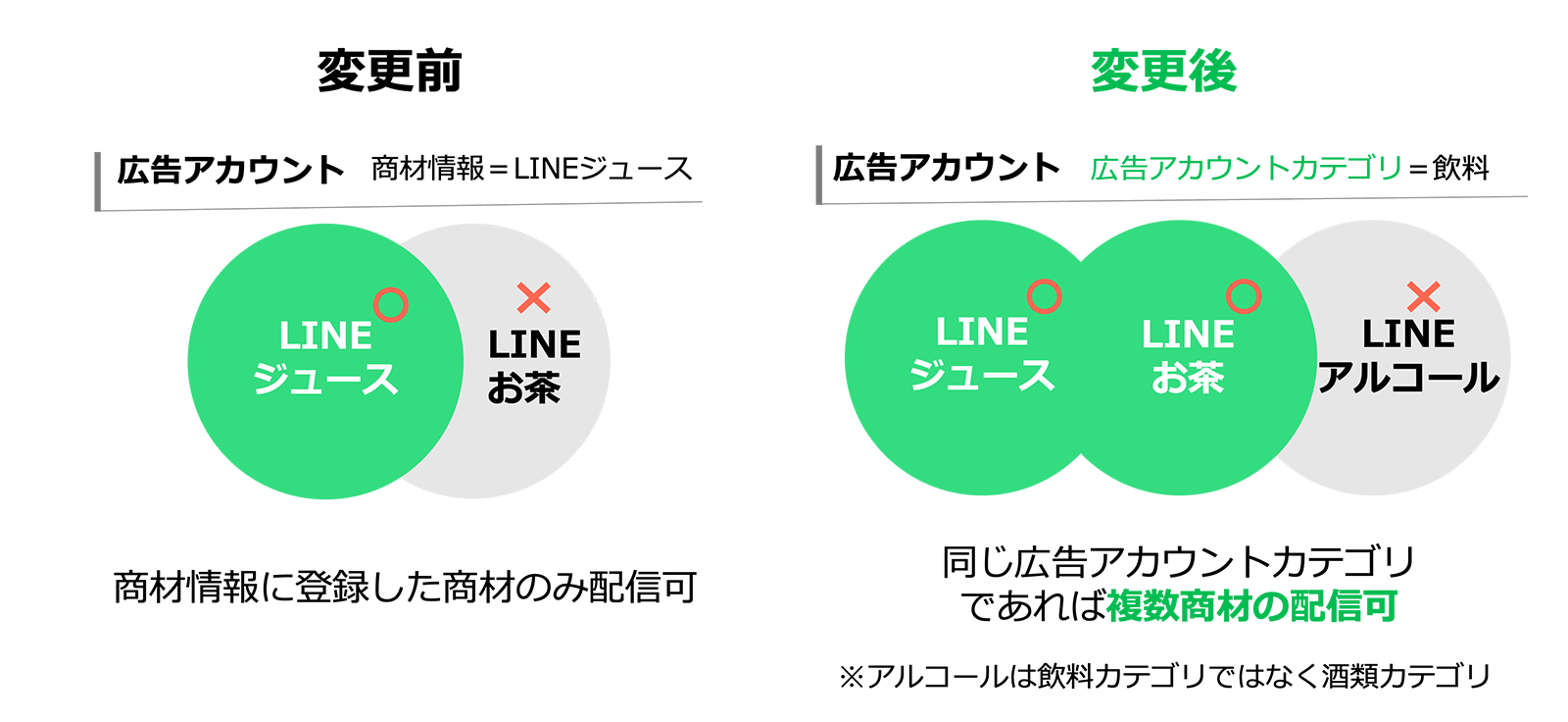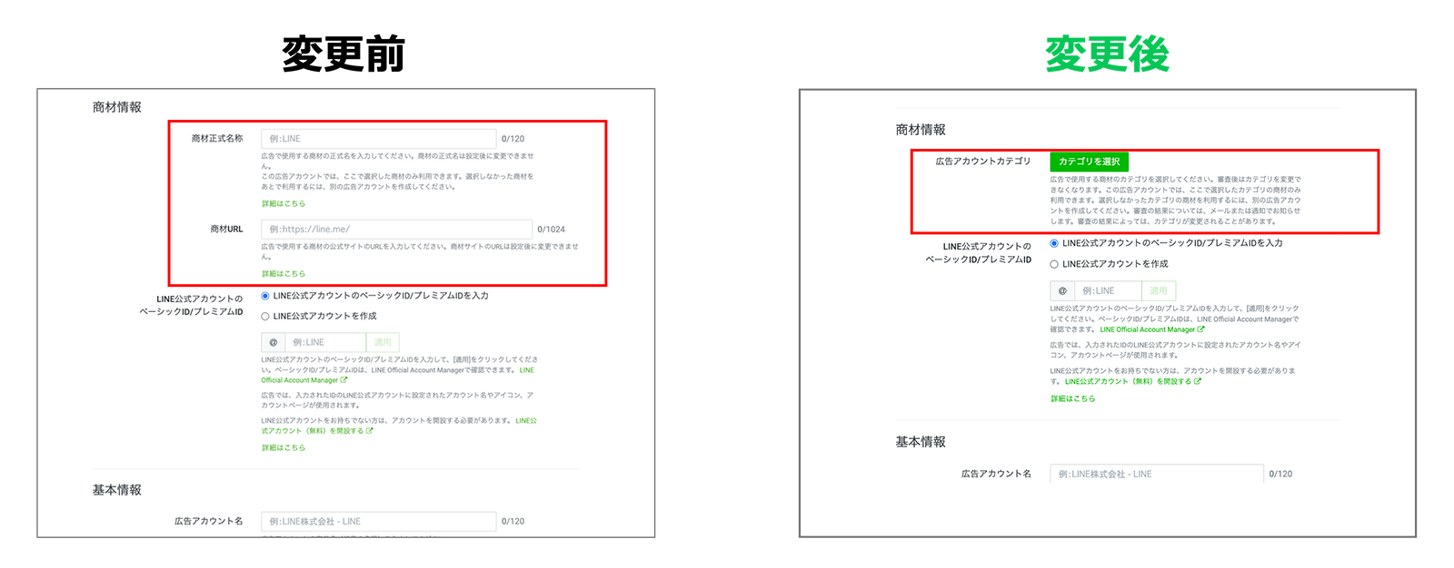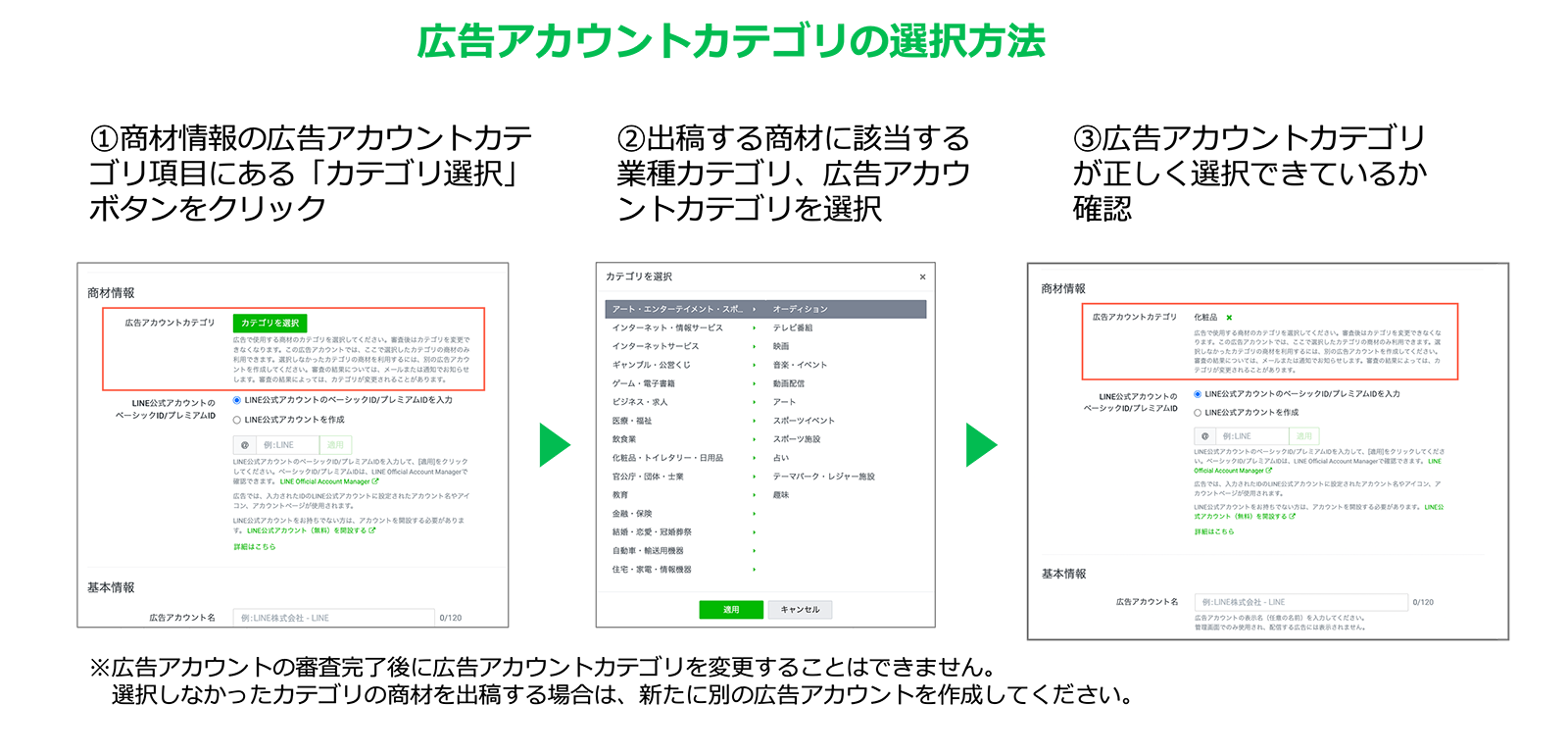 すでに作成済みの広告アカウントについては、入力済みの商材情報をもとにLINE社側で広告アカウントカテゴリを付与するため、引き続き出稿することができます。