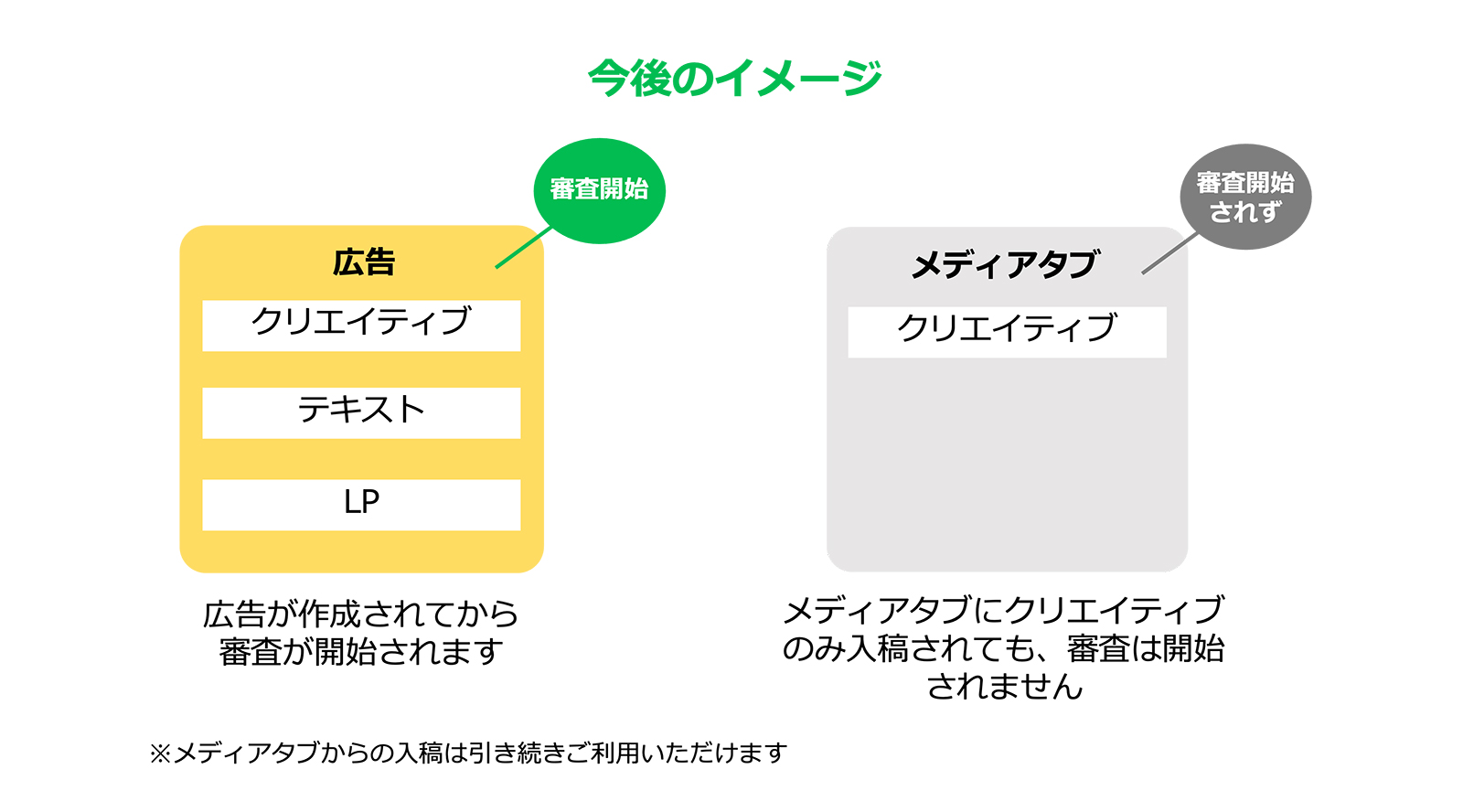 変更前の「クリエイティブ(メディア)審査」では、画像、動画、アニメーションの素材をメディアタブにアップロードした時点で審査が開始されましたが、変更後は素材をアップロードしただけでは審査は開始されません。
