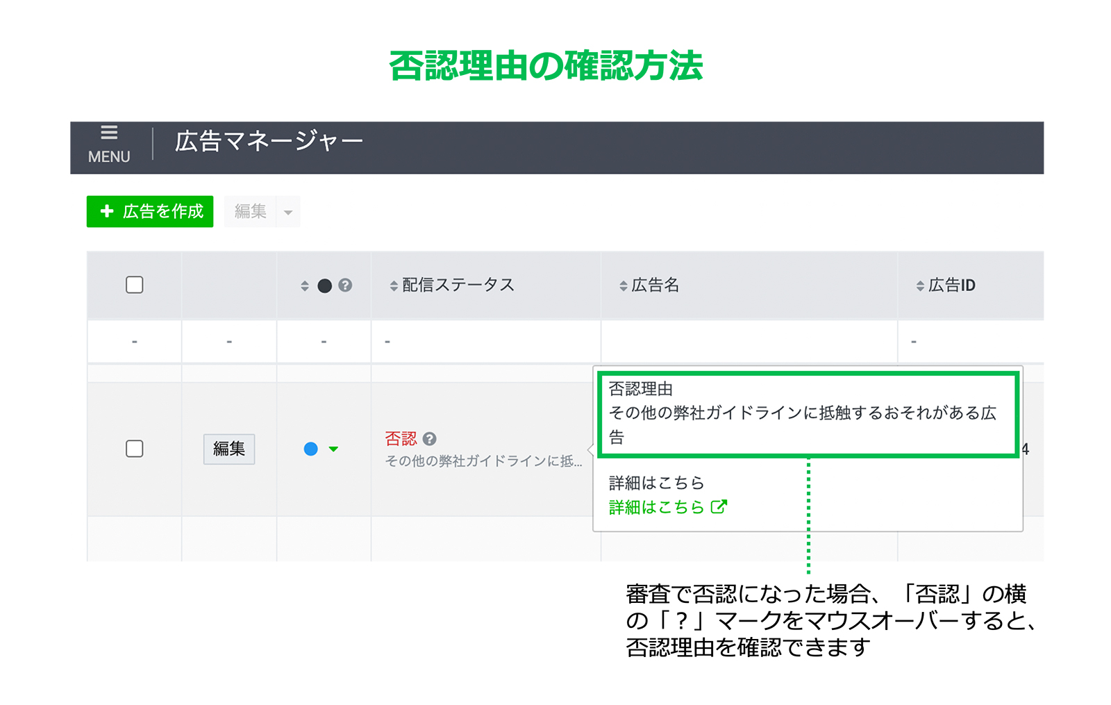 審査で否認になった場合、管理画面の「広告」の「?」マークから否認になった理由と素材を確認できます。また、引き続きメディアタブで「クリエイティブ」ごとの否認理由の確認、「LPの再審査依頼」はご利用いただけます。