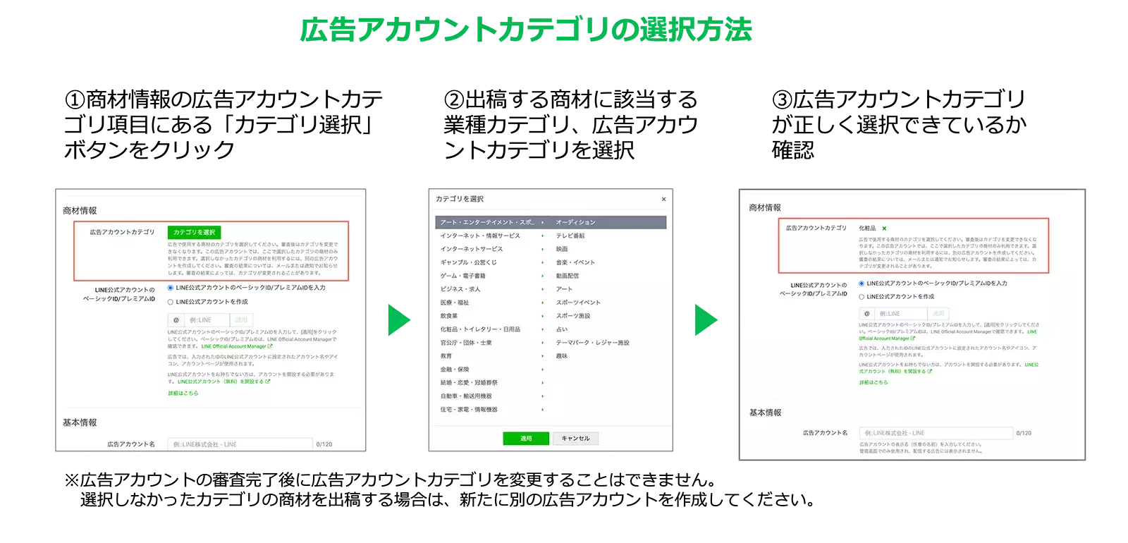 すでに作成済みの広告アカウントについては、入力済みの商材情報をもとにLINE社側で広告アカウントカテゴリを付与するため、引き続き出稿することができます。