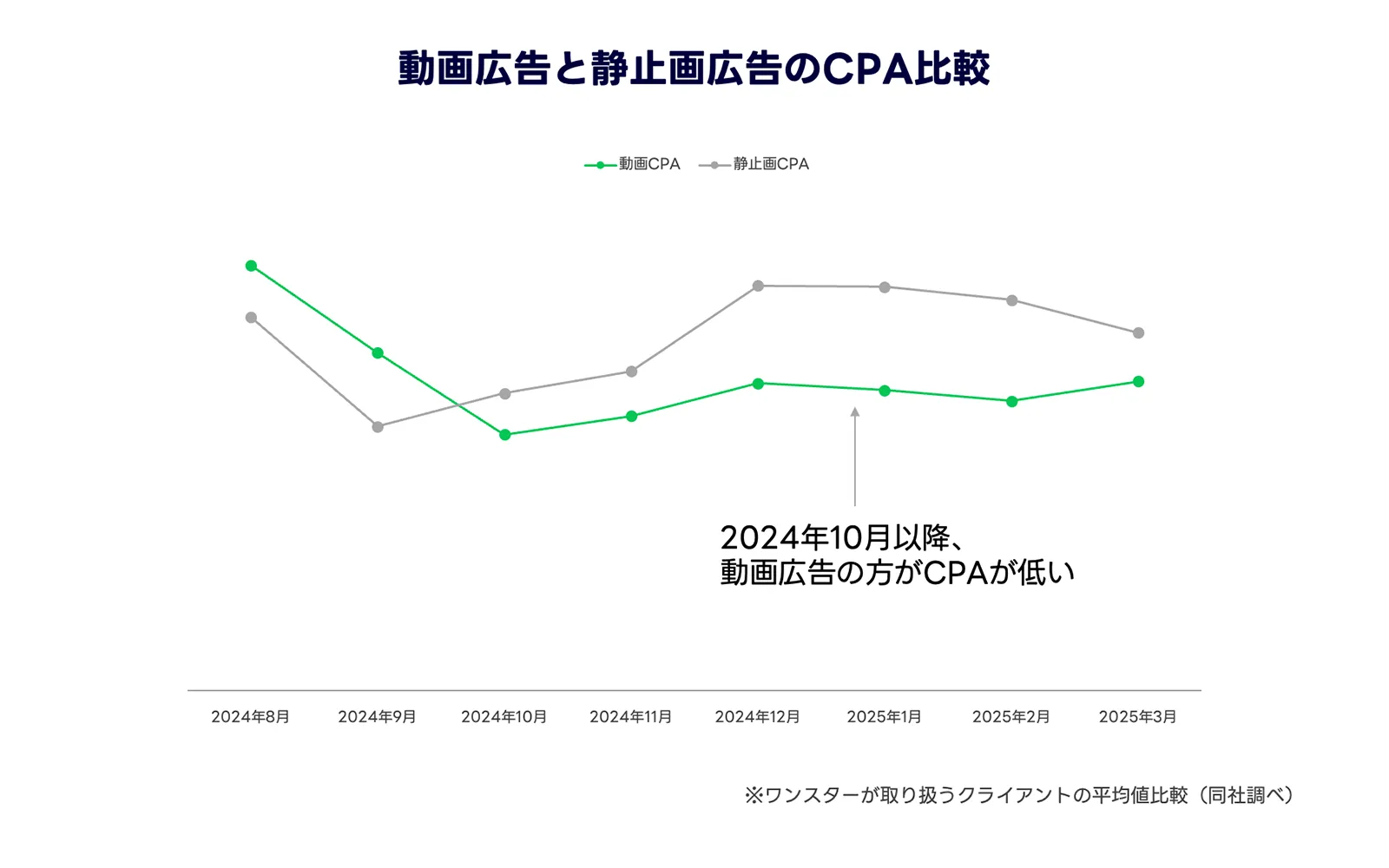 小又氏 弊社がLINE広告ネットワークに注力している理由の一つとして、広告配信先のユーザー数が圧倒的に多く、LINE広告の多様なターゲティング設定を掛け合わせることができるため、広告効果にインパクトが出るという点が挙げられます。また、リワード広告の場合は、全画面表示の15秒や30秒の動画をスキップされることなく見てもらえるので、訴求内容をダイレクトに伝えられる点が魅力です。弊社では2024年10月以降、LINE広告ネットワークにおける動画広告の効果的な活用手法(※詳細は後述)を確立し、CPAを大幅に抑えることに成功しています。現在では、静止画より動画の方がCPAが低く、費用対効果に優れているという結果も得られています。