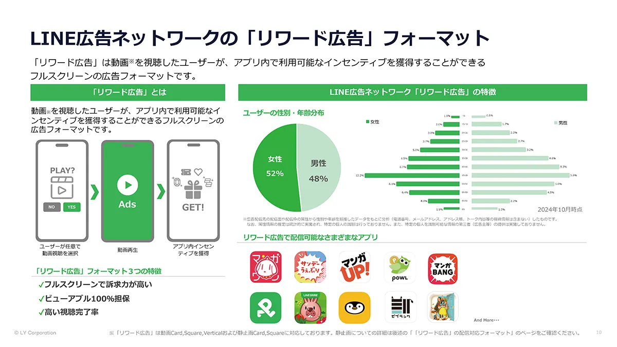 大西 LINE広告ネットワークでは、LINEヤフー独自のオーディエンスデータを活用した高精度なターゲティングが可能です。月間9,900万人(2025年6月末時点)にのぼるLINEユーザーのオーディエンスデータはもちろん、Yahoo! JAPANのデータを利用して独自のユーザーセグメントを作成して配信することもできます。広告クリエイティブは静止画・動画それぞれ複数のサイズに対応しており、配信先アプリの特性に応じて最適な形で表示されます。また、LINE広告ネットワークならではの特徴として「リワード広告枠」への配信にも対応しています。ユーザーがアプリ内で使えるアイテムやポイントなどの特典を得る代わりに広告を視聴する仕組みであるため、訴求力の高い配信が可能です。