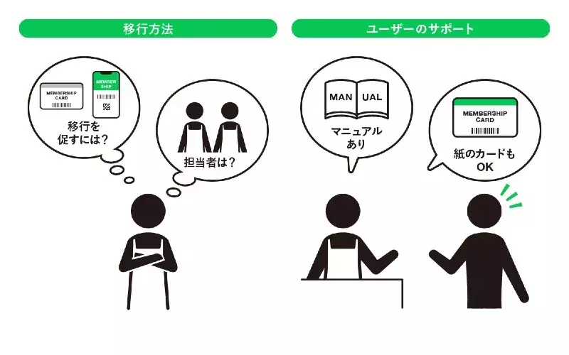 物理的なカードタイプの会員証からデジタル会員証への移行には時間と手間がかかります。ユーザーに対してアプリの利用や登録を促す必要があるほか、移行期間はカードとアプリの両方に対応する必要があります。