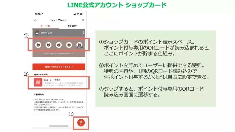 ただし、LINE公式アカウントの機能「ショップカード」でも、ポイントや特典の付与・管理などを行う簡易的な会員証を無料で作成することができますが、機能は限定されます。