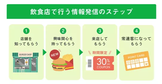 飲食店集客のための情報発信における最終目標は、定期的に来店してくれる常連客づくりです。再来店してもらうために、クーポンやポイントカードなどを発行し、また来店したくなる理由を提供しましょう。例えばLINE公式アカウントではメッセージ配信など多様な機能があり、継続的なコミュニケーションが取れるため、リピーターをつくるのに適しています。