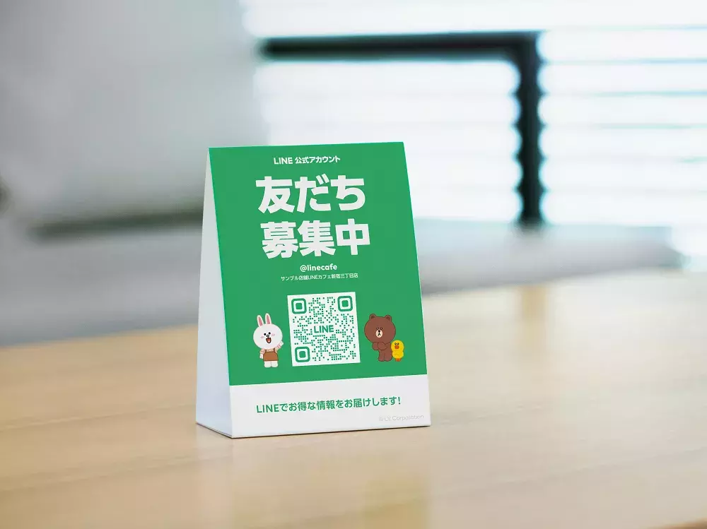 LINE公式アカウントを簡単に友だち追加できるQRコードが印字された、各種ノベルティをご用意しています。店内の目につくスペースやテーブル上に設置することで、友だち集めに効果的です。