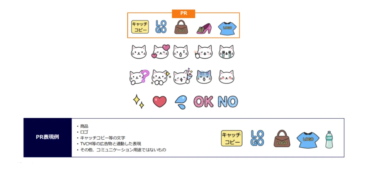 一方、LINE絵文字はサイズが小さいため、複数の要素を詰め込むのは難しいといえます。しかしPR表現の規定に違いがあり、LINEプロモーションスタンプよりもLINEプロモーション絵文字のほうが商品単体の表現やブランドカラーを模した文字表現を実現できます。そのため、企業の世界観をより直接的に表現できる点が強みです。