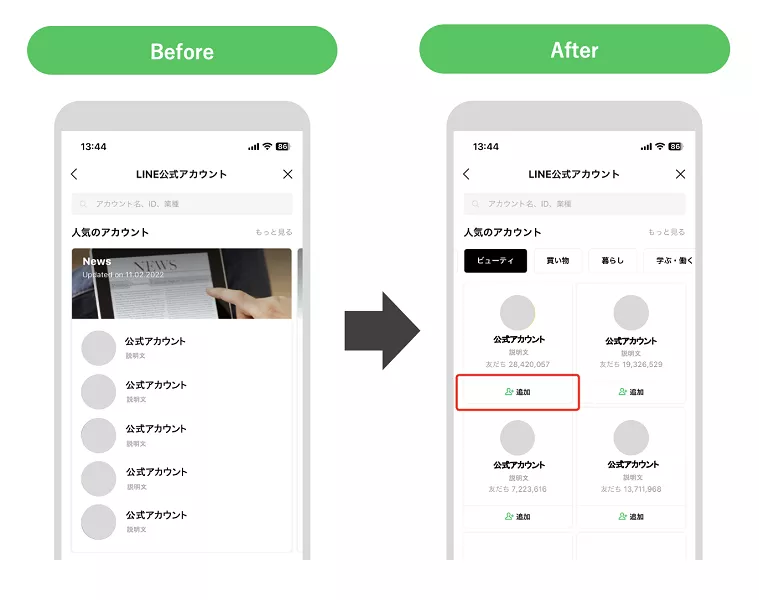 アップデート後はLINE公式アカウントの表示領域に友だち追加ボタンが表示され、プロフィールに遷移しなくても友だち追加が可能になりました。LINE公式アカウントリスト経由の友だち追加数の増加に期待できます。