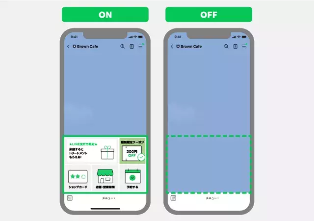 デフォルトで「表示する」を設定すると、ユーザーがトーク画面を開いたとき、リッチメニューがすでに表示された状態になります。「表示しない」に設定すると、メニューバーだけが表示され、ユーザーがメニューバーをタップすることでリッチメニューが表示されるようになります。