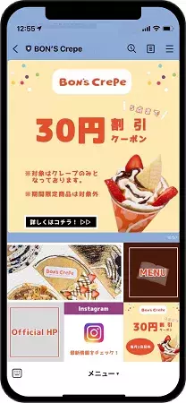 全11店舗を展開する福岡発のクレープ店「BON’S Crepe」では、LINE公式アカウントのメッセージでクーポンを配信していましたが、ユーザーが見逃してしまうことがあるため、リッチメニューにもクーポンの導線を設置しました。また、商品のメニューや自社のSNSやホームページなどの導線を集約してユーザーが情報を得やすいように工夫しています。