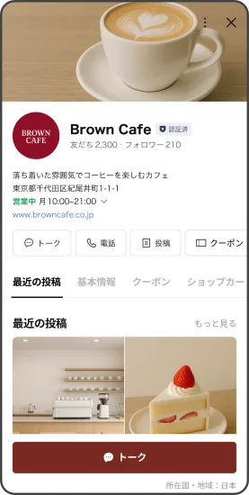 ビジネスプロフィールは、友だち追加時に表示される画面で、Webサイトのトップページのような役割を担います。紹介文、営業時間、住所、地図情報、電話、WebサイトのURLなどの企業・店舗の基本情報が掲載可能です。