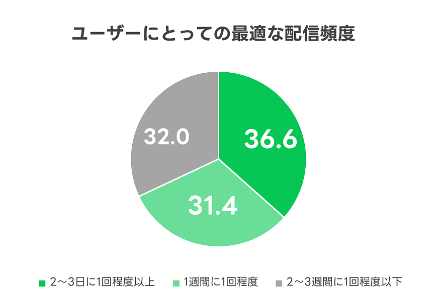 企業や店舗のLINE公式アカウントからメッセージを受け取るユーザーの約7割が、「少なくとも週に1回以上メッセージを受け取りたい」と考えています。メッセージをあまり配信していない場合は、配信頻度を増やしてみましょう。