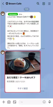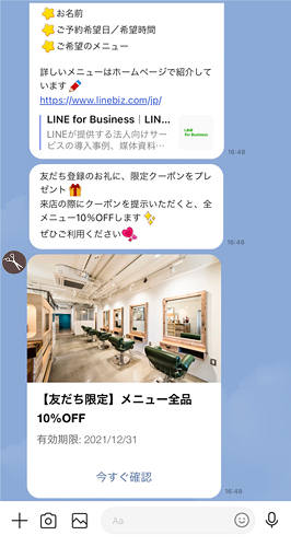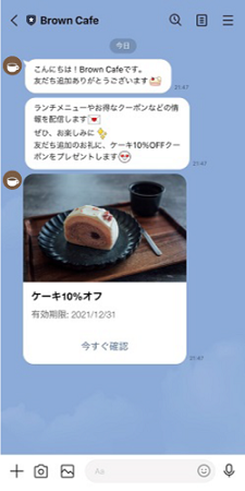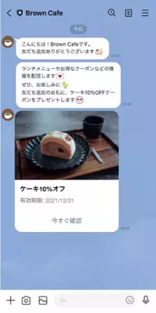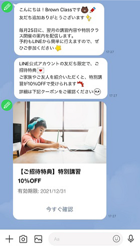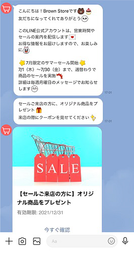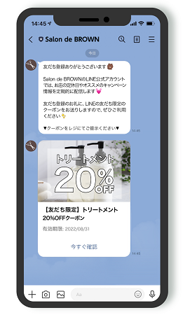 「あいさつメッセージ」でクーポンなどのお得な情報を配信し、「お得な情報が受け取れる」という印象を与えることで、その後の来店や購買を促すことができます。
