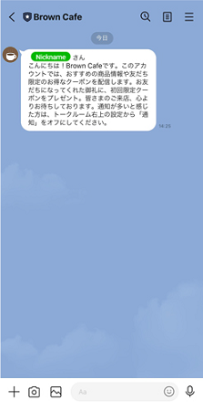こんにちは![企業・店舗名]のLINE公式アカウントをフォローしていただきありがとうございます。