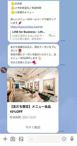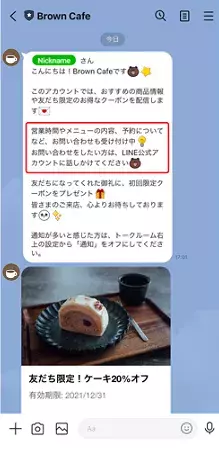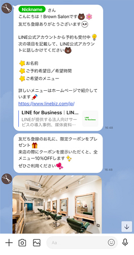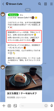 あいさつメッセージでクーポンや営業時間に関する案内をしたうえで、「詳しくは画面下部のメニューからご覧ください」と促すと、ユーザーが次に取るべきアクションがわかり、ユーザビリティーの向上につながります。