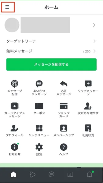 1. LINE公式アカウントの管理アプリ(App)を開き、左上の3本線をタップしてください。