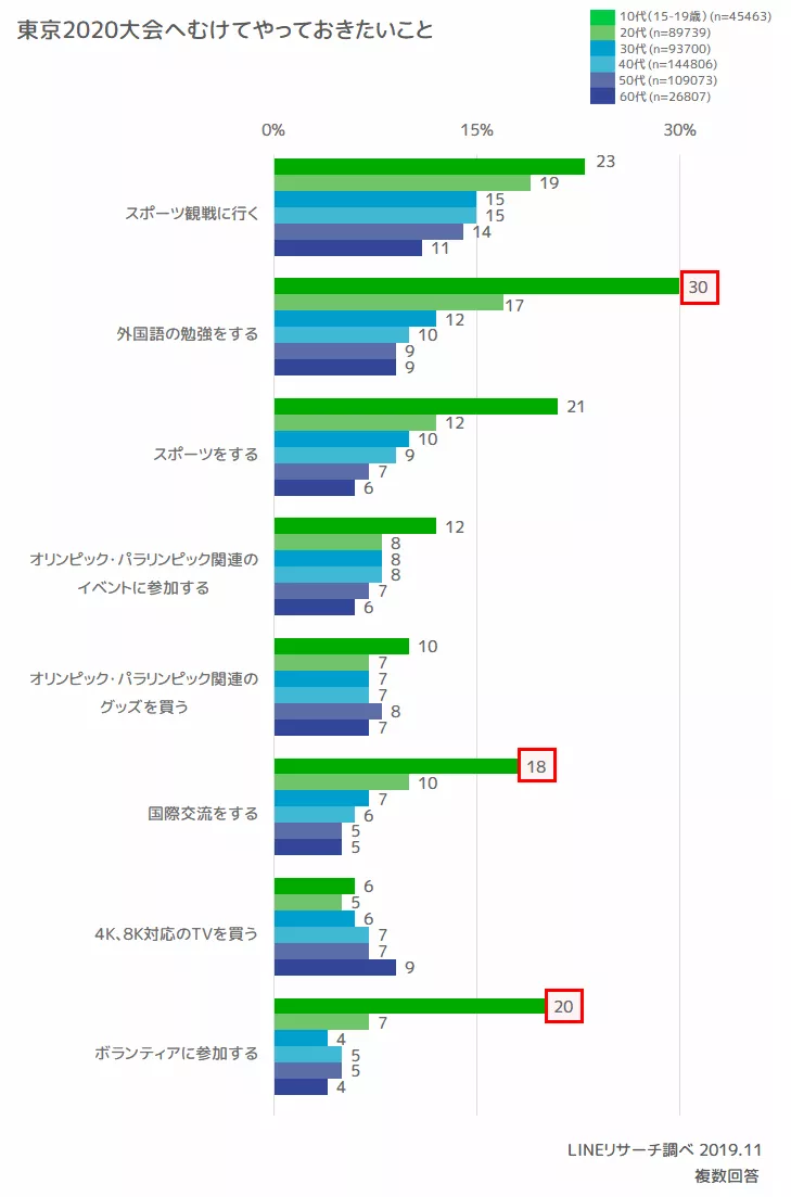 オリンピック・パラリンピックにむけてあなたがやっておきたいことをアンケートした結果、10代とそれ以外の年代で違いが見られました。
