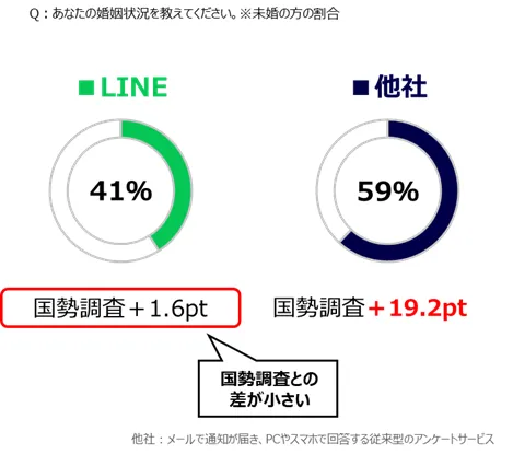 LINEリサーチモニターと国勢調査の未婚率の比較をしたところ、非常に近い結果となりました。