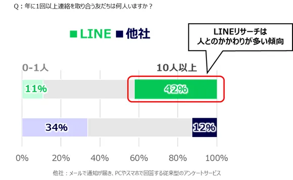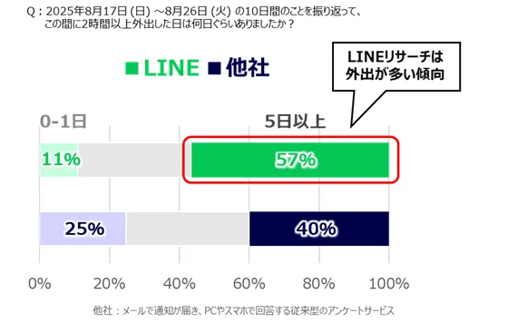 こうした差は、LINEリサーチのモニターが特別に社交的というよりも、日常的な行動量が、より一般的な生活者像に近い層が多いことを示しているとLINEリサーチは考えています。