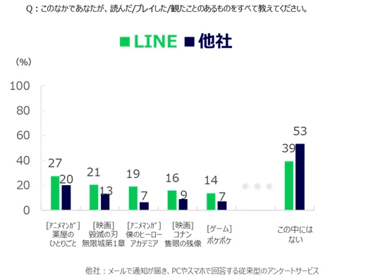 コンテンツ接触経験では、LINEリサーチモニターは「読んだ/プレイした/観た」コンテンツが多く、他社モニターとスコアが2倍以上異なるものがあります。また、「この中にはない」という回答も他社に比べて低い結果となっています。