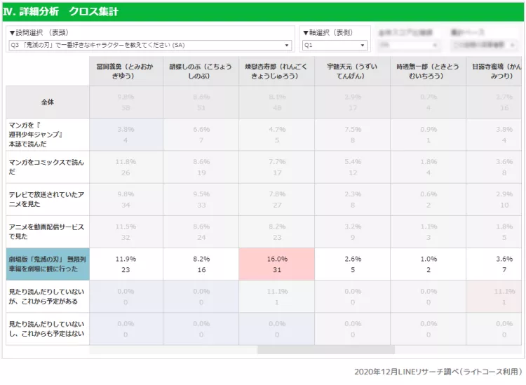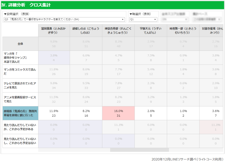また、「一番好きなキャラクターは?」の設問と、「鬼滅の刃のマンガ・アニメで読んだ観たものは?」の設問でクロス集計をしました。総合ランキングでは6位の煉獄杏寿郎(れんごく きょうじゅろう)ですが、劇場に観に行った方の中では、ダントツNo.1という結果でした。