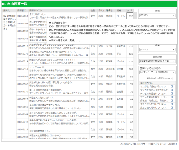 劇場版を観に行ったと回答した方に、よかった・感動した場面について聞いてみました。ストーリーの詳細な内容も多く含まれるため詳しくはご紹介できませんが、レポートを見ると「!」の多さや文章量から熱い思いが伝わってきます。