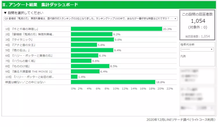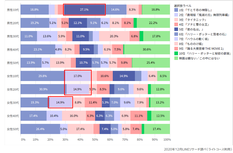 また、『千と千尋の神隠し』は女性10代・20代でそれぞれ約3割が「一番好き」と回答しています。『アナと雪の女王』、『劇場版「鬼滅の刃」無限列車編』は、10代~40代の女性の支持が牽引する結果となりました。