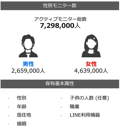 - アクティブモニターとは、LINEアンケートの会員としてプロフィール登録が完了しているユーザーを指します。