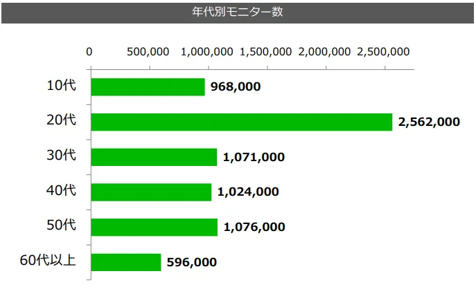 アクティブモニターのうち10~20代の若年層が約半数を占めています。 学生や若年層、学生種別ごとなど出現率の低い調査も実施可能です。