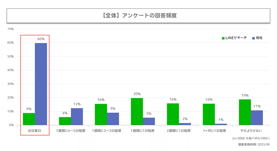従来型モニター(他社モニター)は、LINEリサーチモニターに比べ、アンケートの回答に積極的な傾向がある。