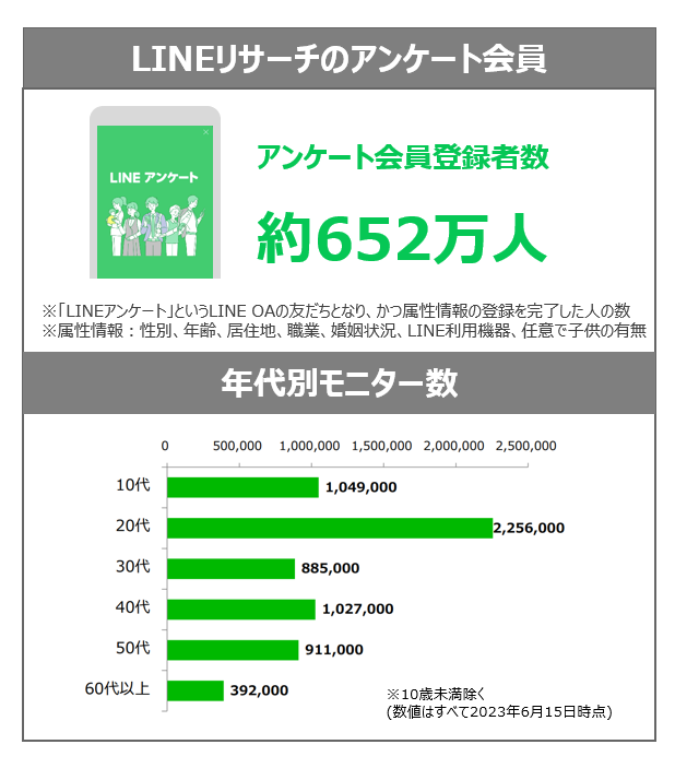 LINEリサーチは、スマートフォン専用のリサーチサービスである「LINEアンケート」会員を保有。約650万人のアンケート会員のうち半数以上が10代20代で構成されています。