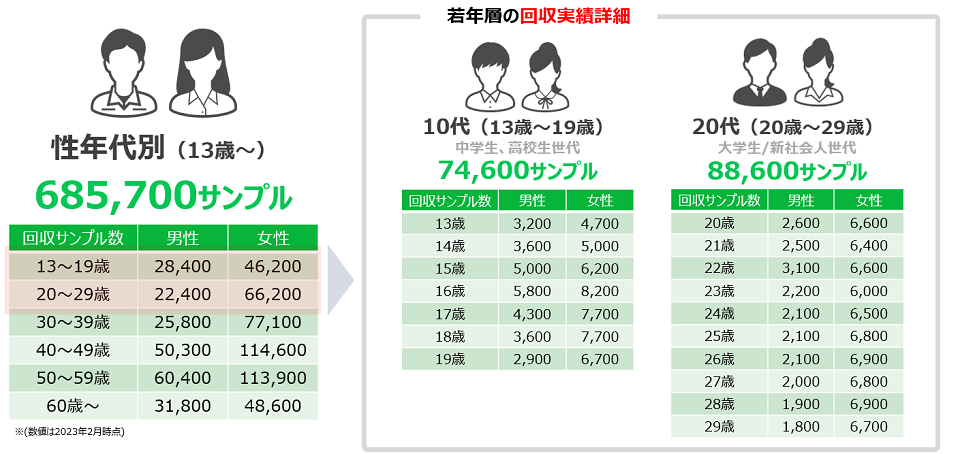 こちらをみていただくとわかるように、10代では74,600サンプル、20代では88,600サンプルの回収実績があり、男女別1歳ごとにみても多くの回収が見込めることがわかると思います。