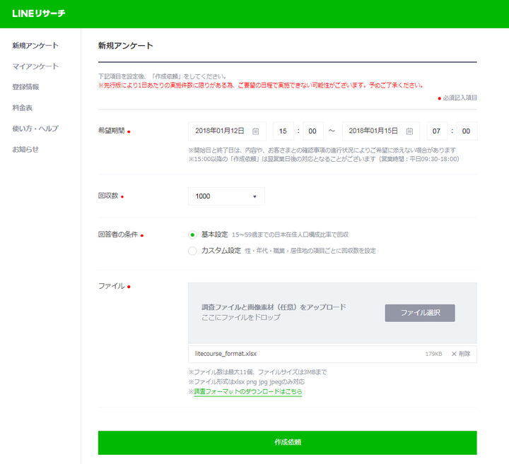 2.「希望期間」「回収数」「回答者の条件」を入力する