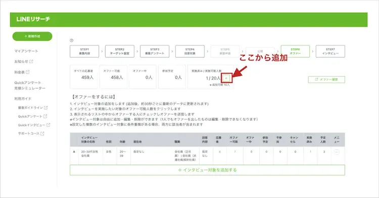 募集アンケートの結果、想定以上にインタビューしたいモニターが見つかった場合や、新たな課題の深掘りが必要になった場合に、上限10名までインタビュー人数を追加できるようになりました。