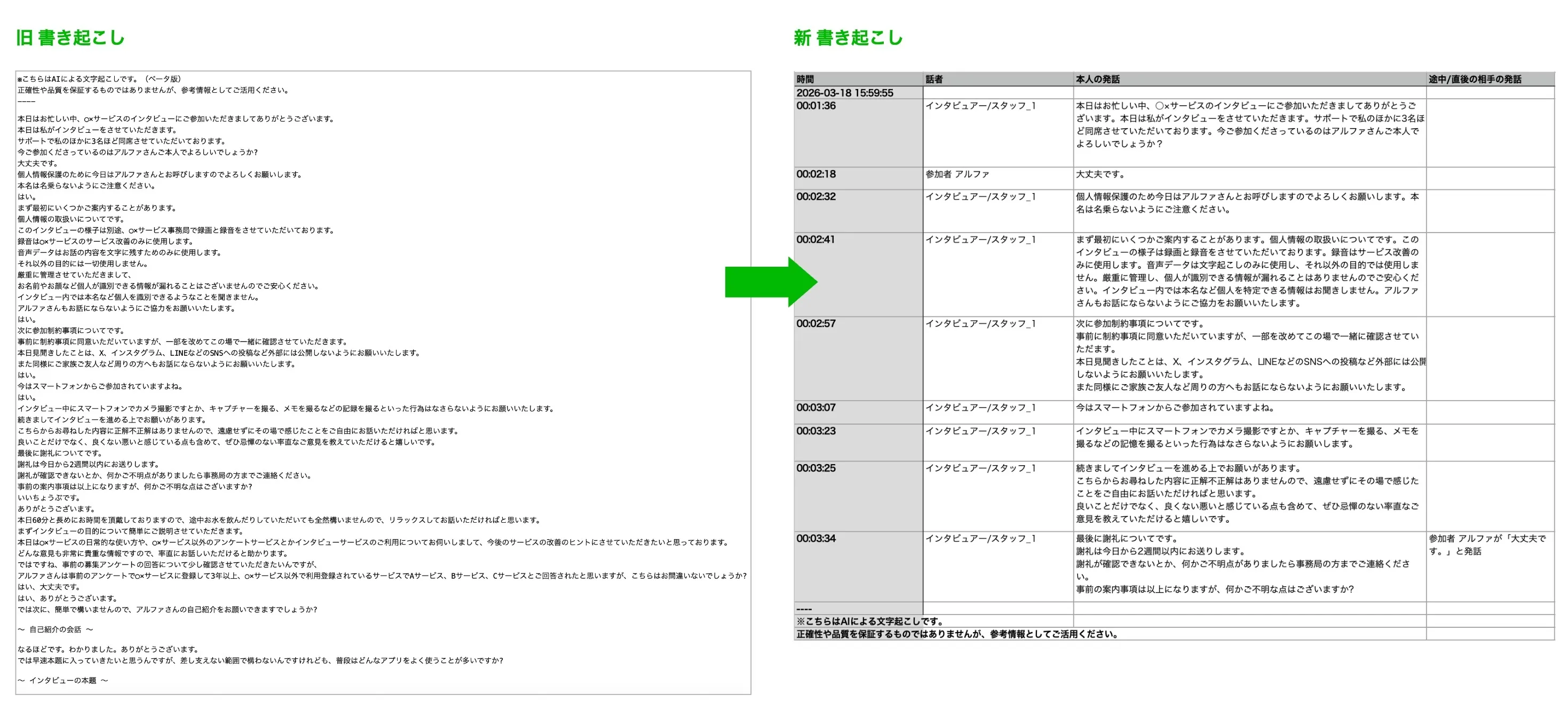 今回のアップデートで、書き起こしを話した人ごとに整理して確認できるようになりました。