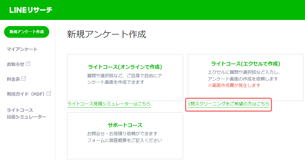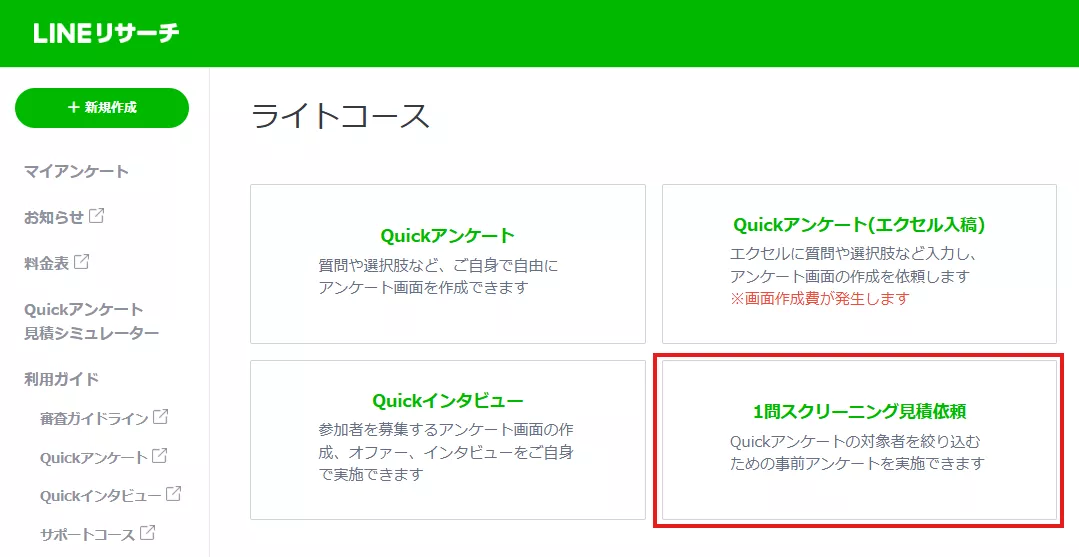 「1問スクリーニング」をご希望の場合、まずはマイアンケートログイン後、新規作成画面の見積依頼フォームより依頼をしてください。