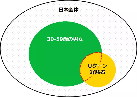 一方で、「日本全体の30-59歳男女のUターン経験者」が200万人いたとすると、出現率は 200万÷4,880万=約4%となります。