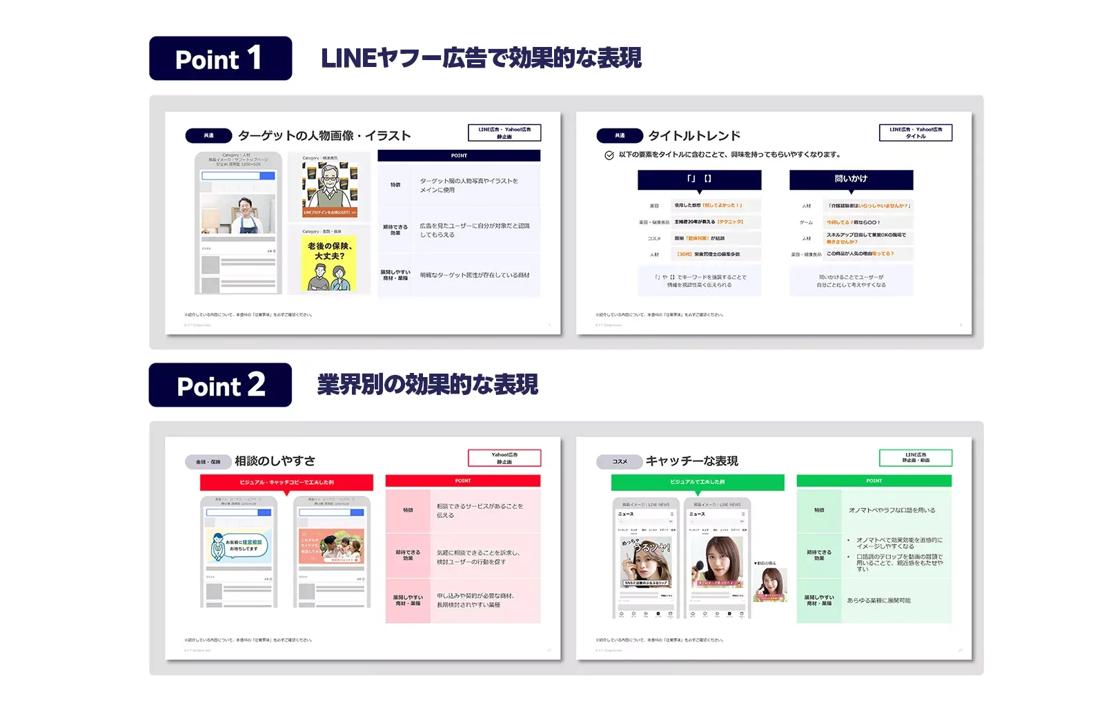 クリエイティブトレンドでは、LINEヤフー広告において、業種を問わないトレンドの表現と、業種別のトレンドの表現をポイントとともに解説しています。