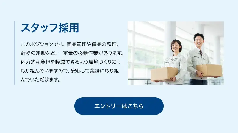 | 体力に自信のある方歓迎 | 一定量の移動作業がある仕事です |