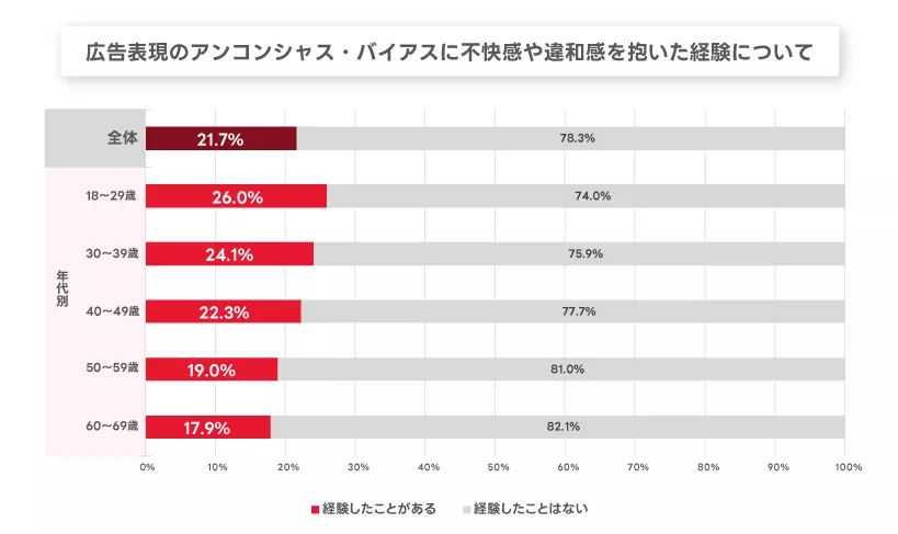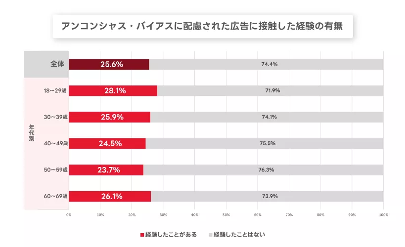 アンコンシャス・バイアスに配慮した広告に接触した経験の有無については、全体の26%が「これまでに経験したことがある」と回答。不快感・違和感を抱いた経験があるユーザーの割合(22%)よりやや高い結果となっています。