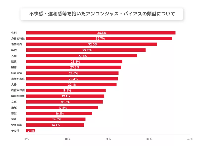 では、ユーザーはどんな内容の広告表現にアンコンシャス・バイアスを感じて、不快感や違和感を抱いたのでしょうか。17の類型から選んでもらいました(複数回答)。
