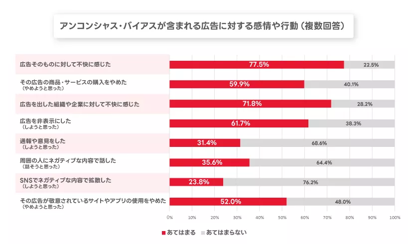 自社内にたくさんある商材の中のひとつのクリエイティブであっても、出稿元である組織・企業への不快感につながる可能性があるため、アンコンシャス・バイアスを含んだ広告になっていないかを意識して広告を制作することの重要性が伺えます。