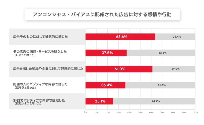 アンコンシャス・バイアスに配慮された広告に対する感情や行動については、項目ごとの全体値を比較すると、【広告そのものに対して好意的に感じた】ユーザーの割合が64%となっており、全項目の中で最も高い結果となっています。