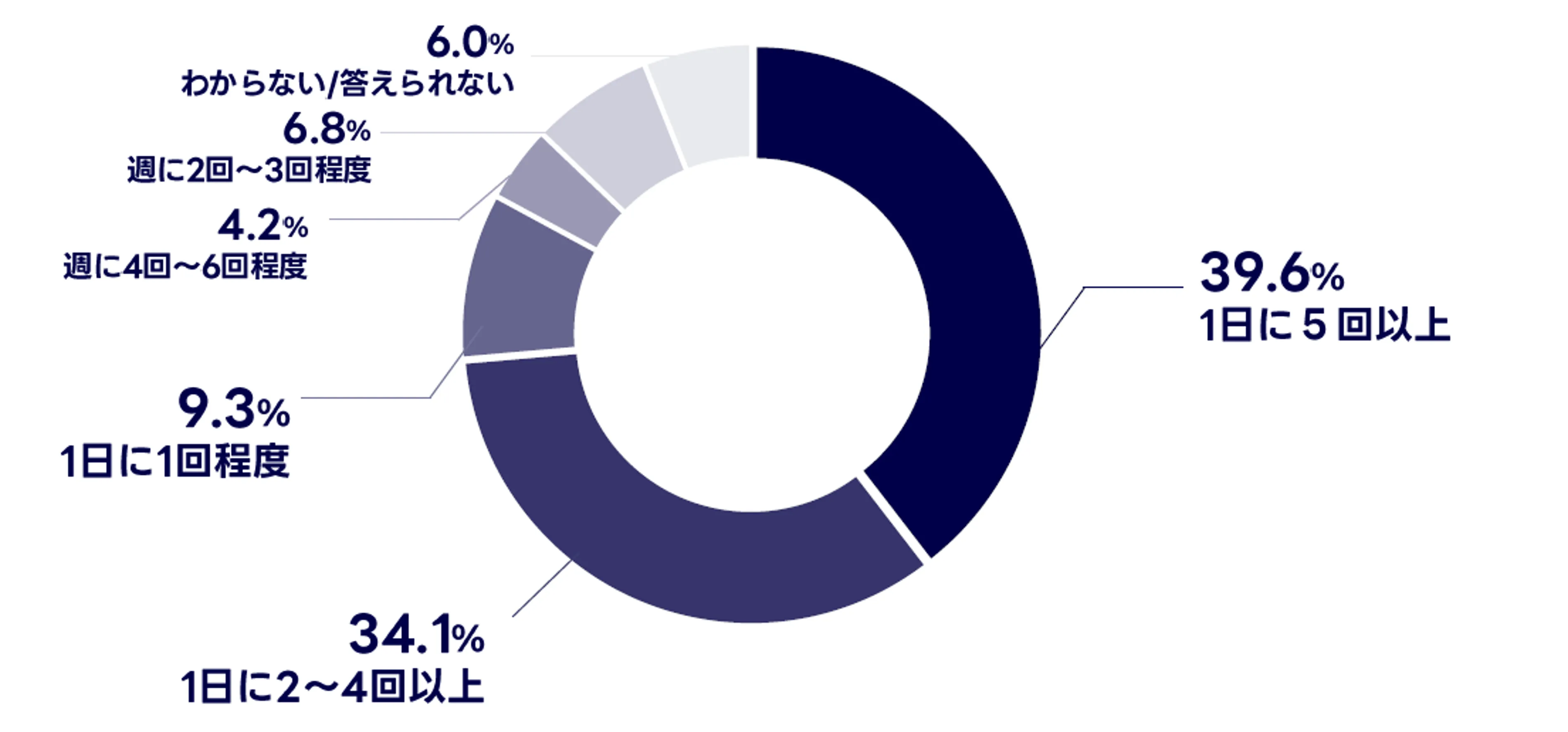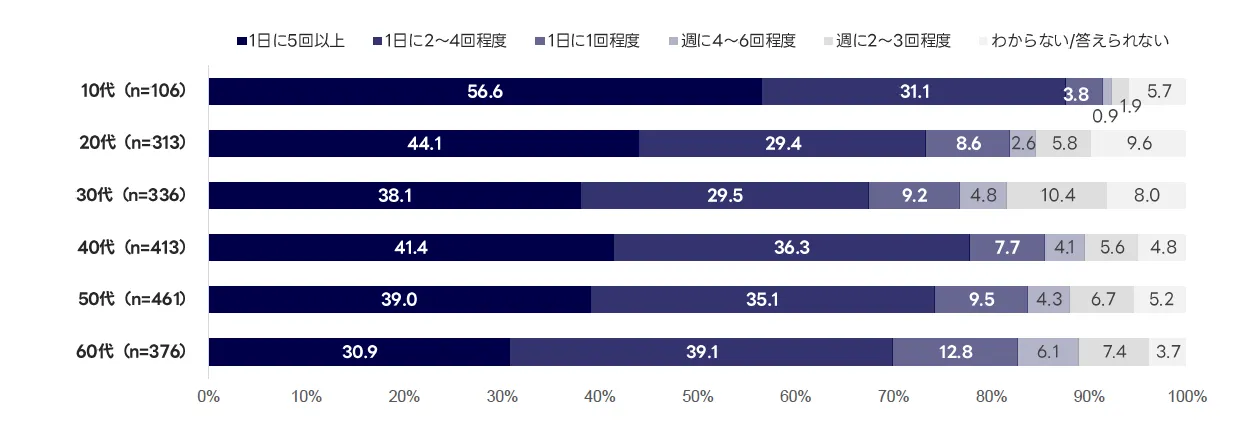 本調査対象である日常的に検索を行うユーザーの直近1週間の検索回数を見ると、約8割が「1日1回以上検索している」と回答しています。さらに、約4割は「1日に5回以上」検索していると回答しており、検索行動が情報収集の基本的な行動として生活の中に深く根付いている様子がうかがえます。