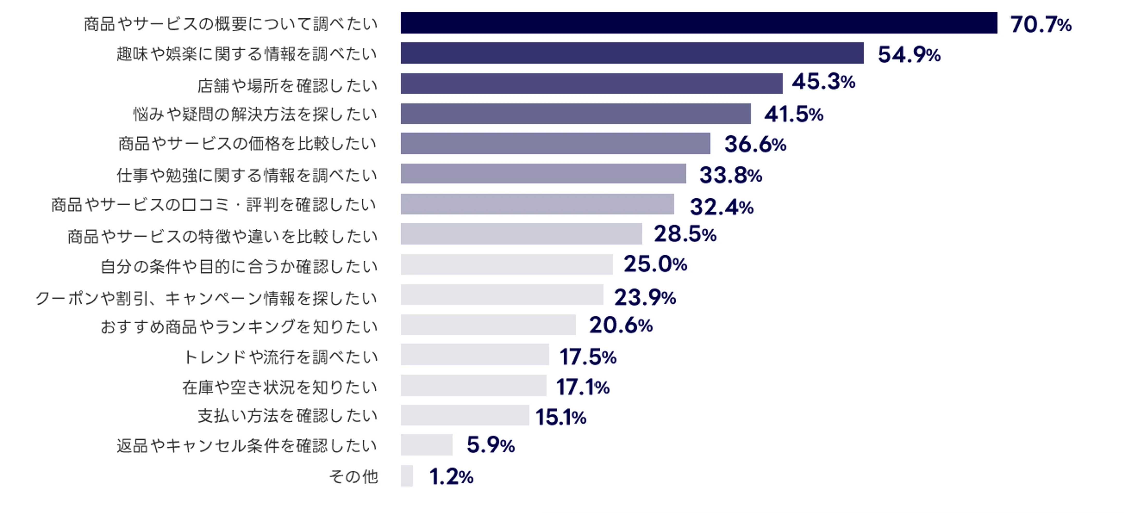検索の目的については、「商品やサービスの概要について調べたい」が最も多く、これに「趣味や娯楽に関する情報を調べたい」「店舗や場所を確認したい」が続いています。検索を通じて、正確で確かな情報を得たいと考えるユーザーが多いことがわかります。