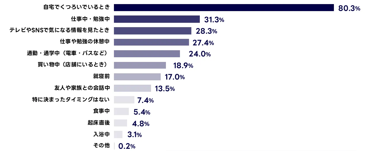 検索を行うタイミングとして最も多かったのは「自宅でくつろいでいるとき」で、8割以上を占めました。また、「仕事中・勉強中」や「テレビやSNSで気になる情報を見たとき」など、何かをしている最中に検索するユーザーも一定数存在しています。日常のさまざまなシーンで検索が行われている様子がうかがえます。