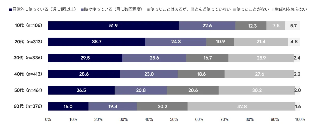 なお、生成AIの利用頻度を年代別に見ると、若年層を中心に日常的な利用が進んでいる傾向が見られました。